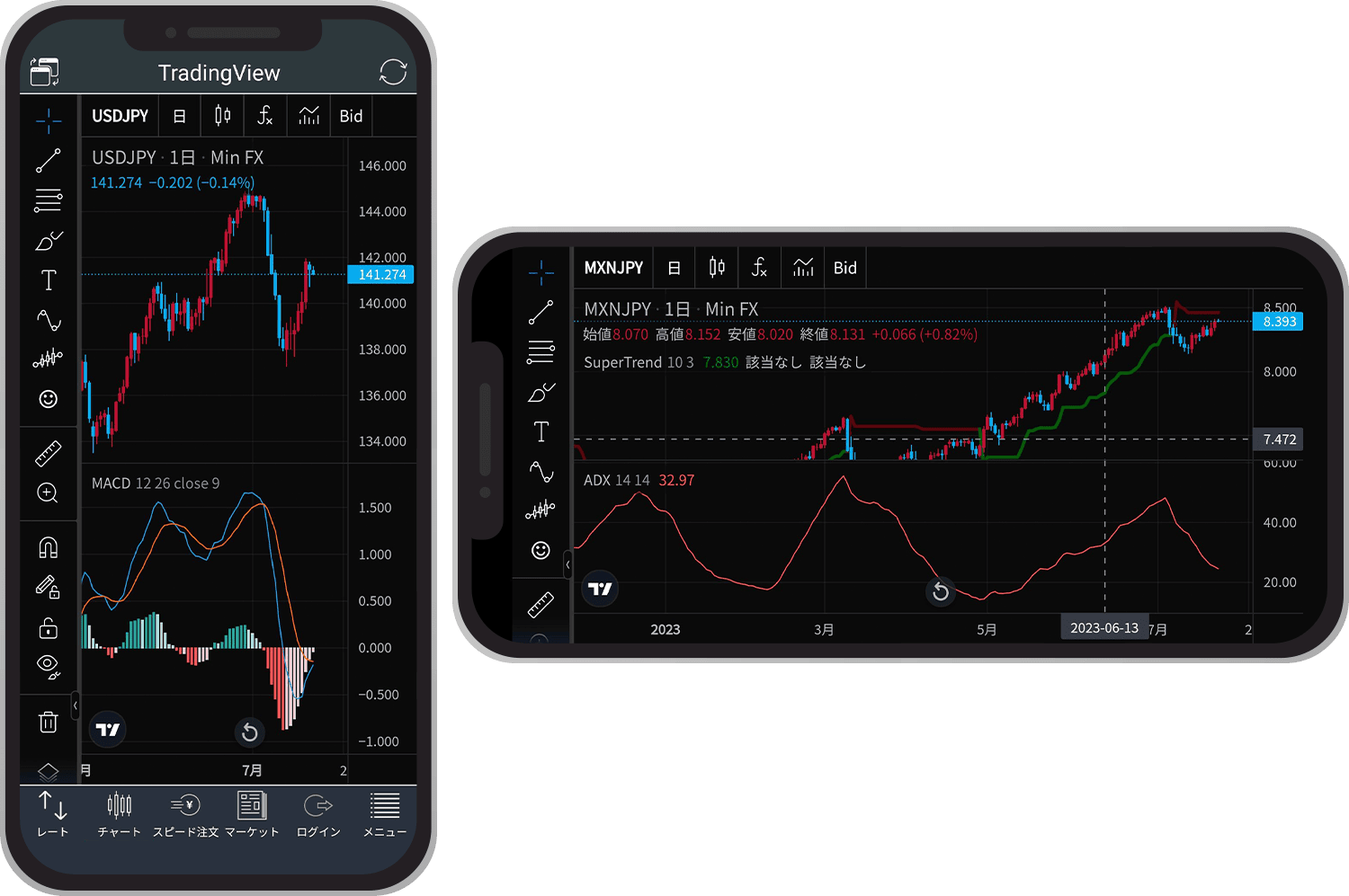 PCツール版と同様にテクニカル指標と描画ツールはそれぞれ80種類以上を搭載。