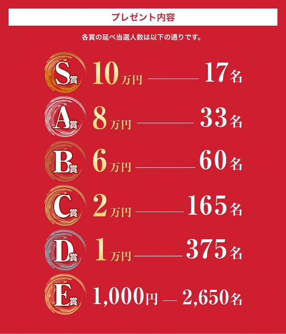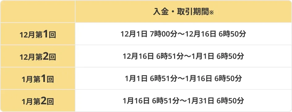 12月・1月のいずれの期間でも第1回・第2回を連続達成すると。第2回抽選の当選確率が2倍になります。