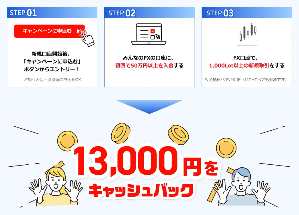 他社(LIGHT FXは除く)でFX取引をされていた方でキャンペーン期間中にみんなのFXにて新規口座申込、および下記のキャッシュバック条件STEP1~3を全て満たされた対象のお客様に13,000円をキャッシュバックいたします。