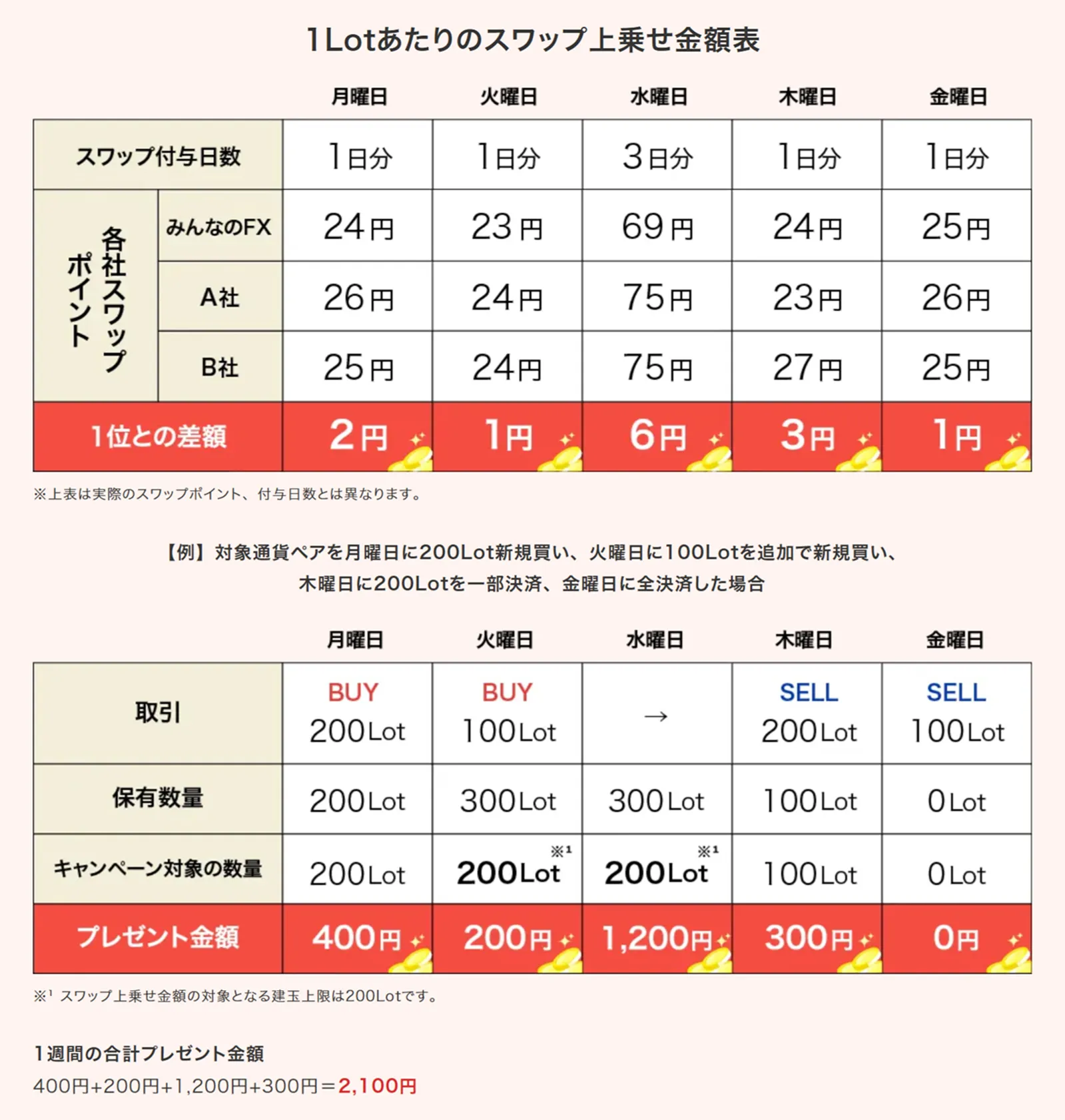 キャンペーン期間中、FX口座における「メキシコペソ/円 LIGHT」「トルコリラ/円 LIGHT」の新規買ポジションに対して、当社が毎営業日提示するスワップポイントが他社より1円でも安い場合は、差額をキャンペーン期間終了後にまとめてプレゼントいたします。それにより、実質、業界最高水準のスワップポイントをご提供いたします。