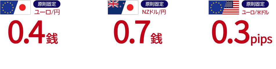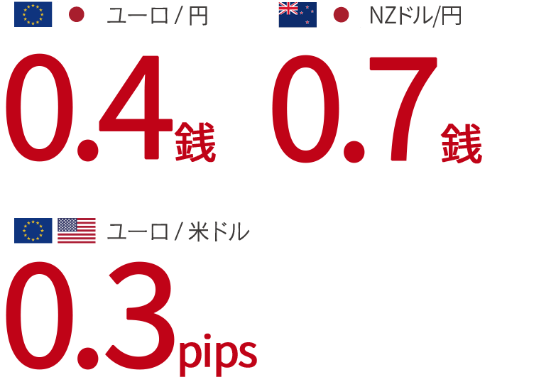 USD/JPY LIGHT:3.88銭、EUR/JPY:9.9銭、NZD/JPY:9.9銭、EUR/USD:3.9pips