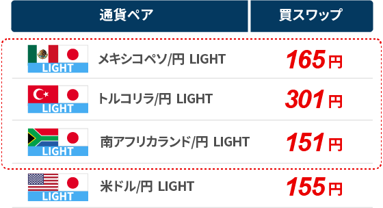 ※メキシコペソ/円 LIGHTとトルコリラ/円 LIGHT、南アフリカランド/円 LIGHTは10Lot、それ以外は1Lotを保有した場合の金額です。