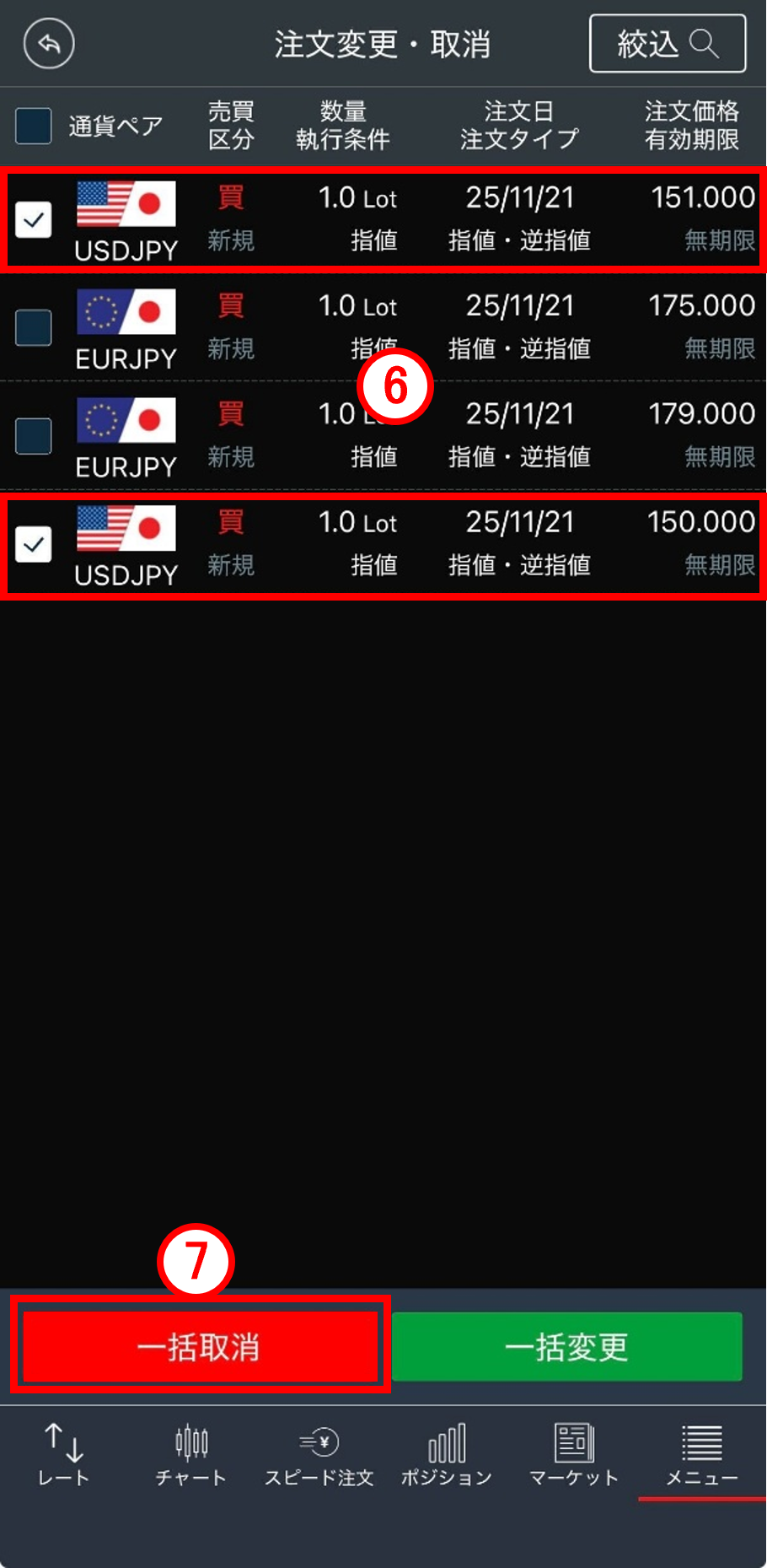 「一括取消」をタップすると、注文一括取消画面が表示されます。