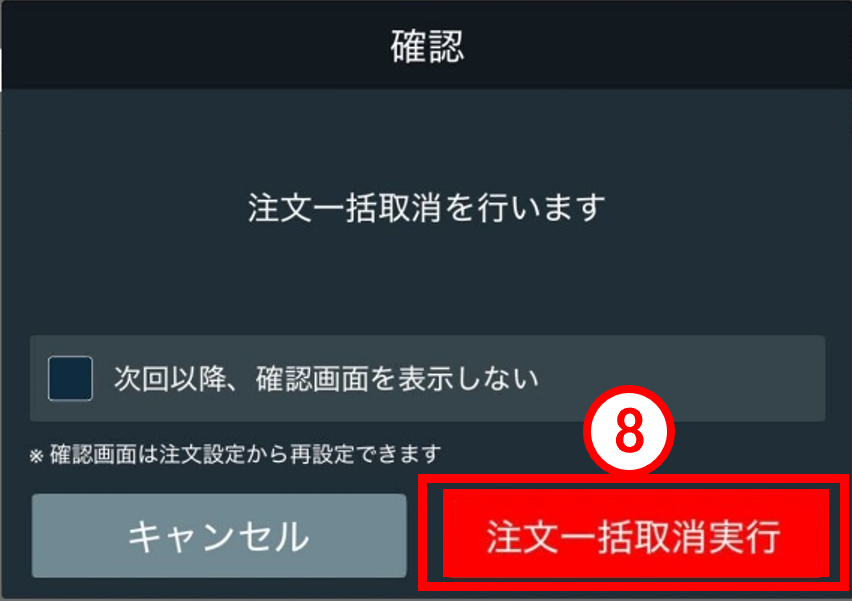 」の確認画面表示の設定がOFFの場合、注文一括取消確認画面は表示されません。
