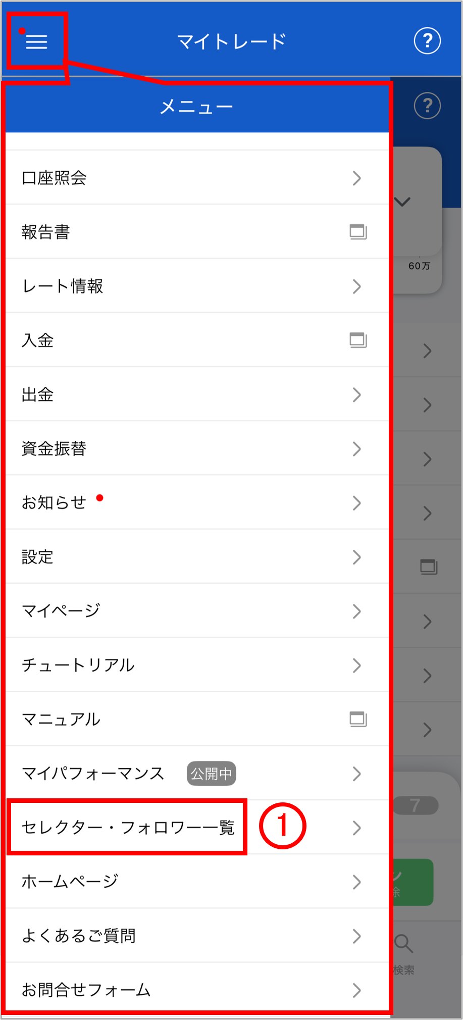 「マイトレード」のメニューより「セレクター・フォロワーリスト」をタップすると、セレクター・フォロワーリストが表示されます。
