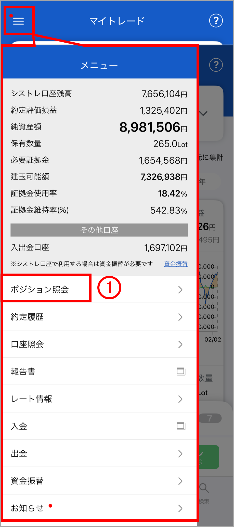システムトレードで保有しているポジションの約定状況や損益等の詳細状況を確認することができます。また、⼿動での成⾏決済も可能です。