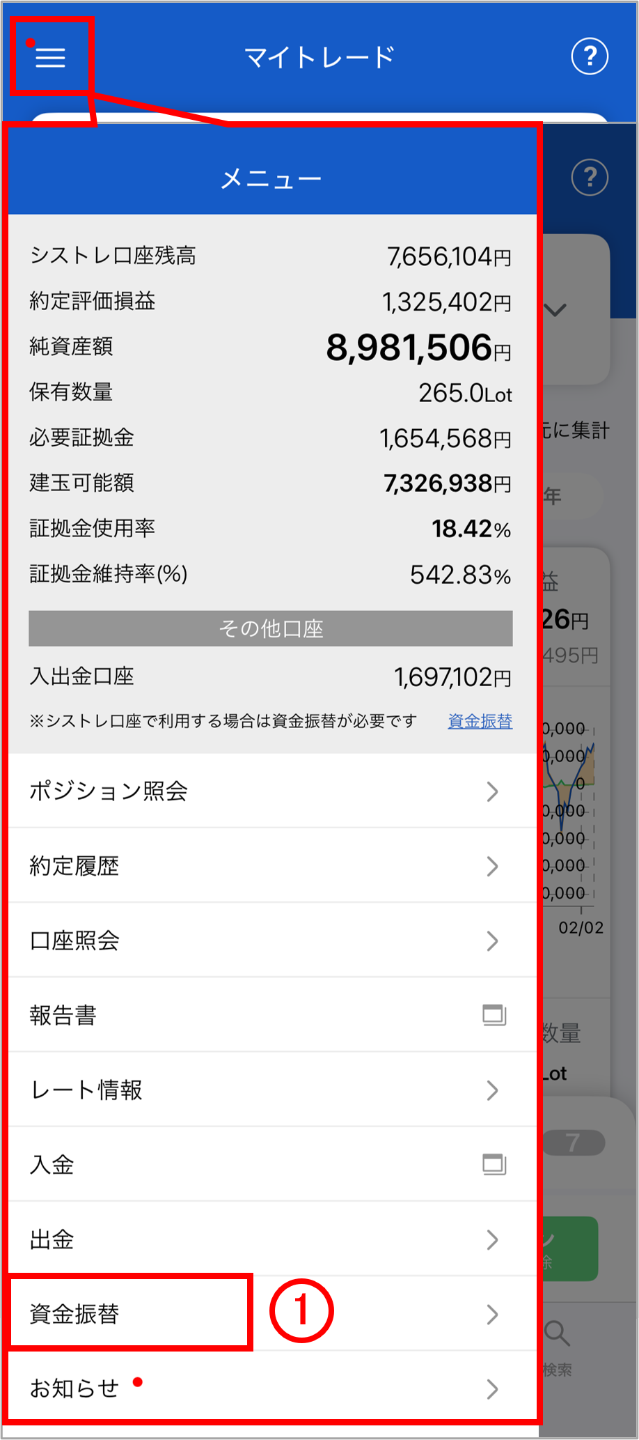 「マイトレード」のメニューより「資金振替」をタップすると、「マイページ」の資金振替画面へ遷移します。