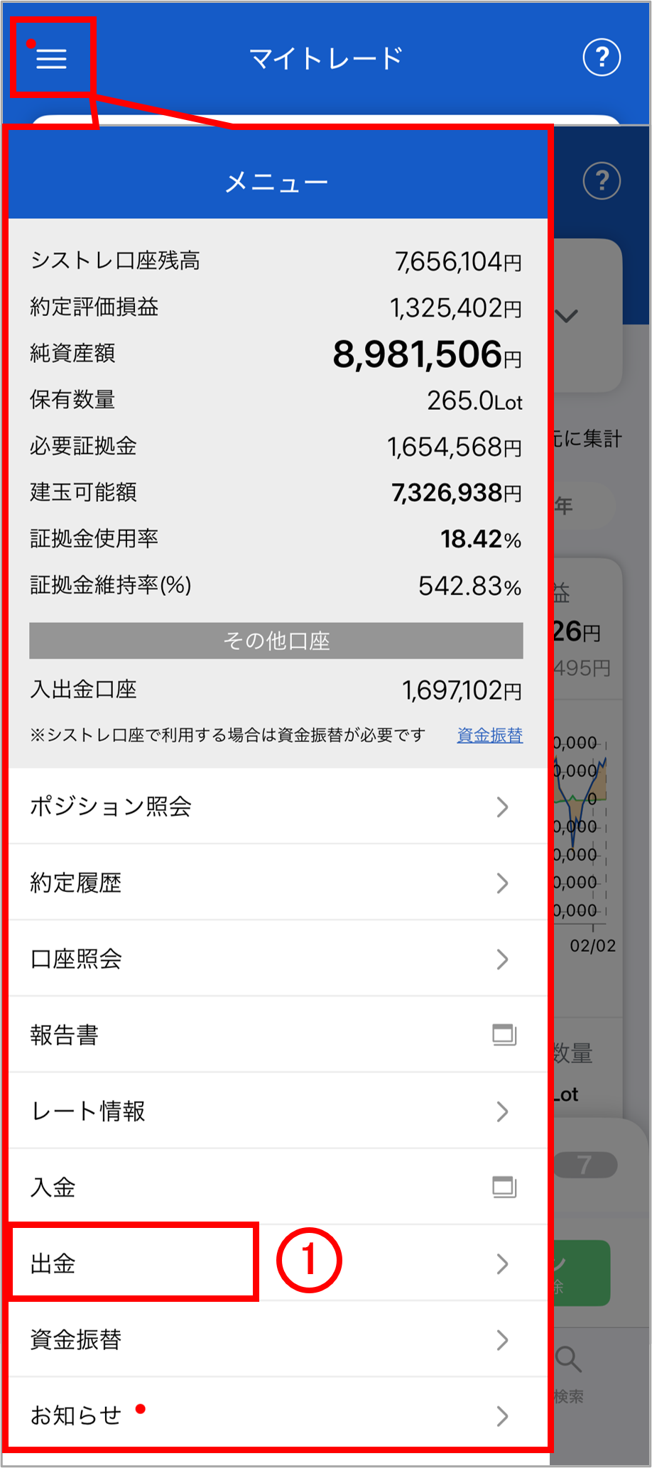 「マイトレード」のメニューより「出金」をタップすると、「マイページ」の出金画面へ遷移します。