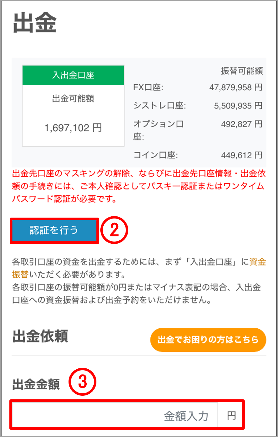 ※ご出金は「入出金口座」から行います。シストレ口座に残高がある場合、「入出金口座」へ資金振替が必要です。