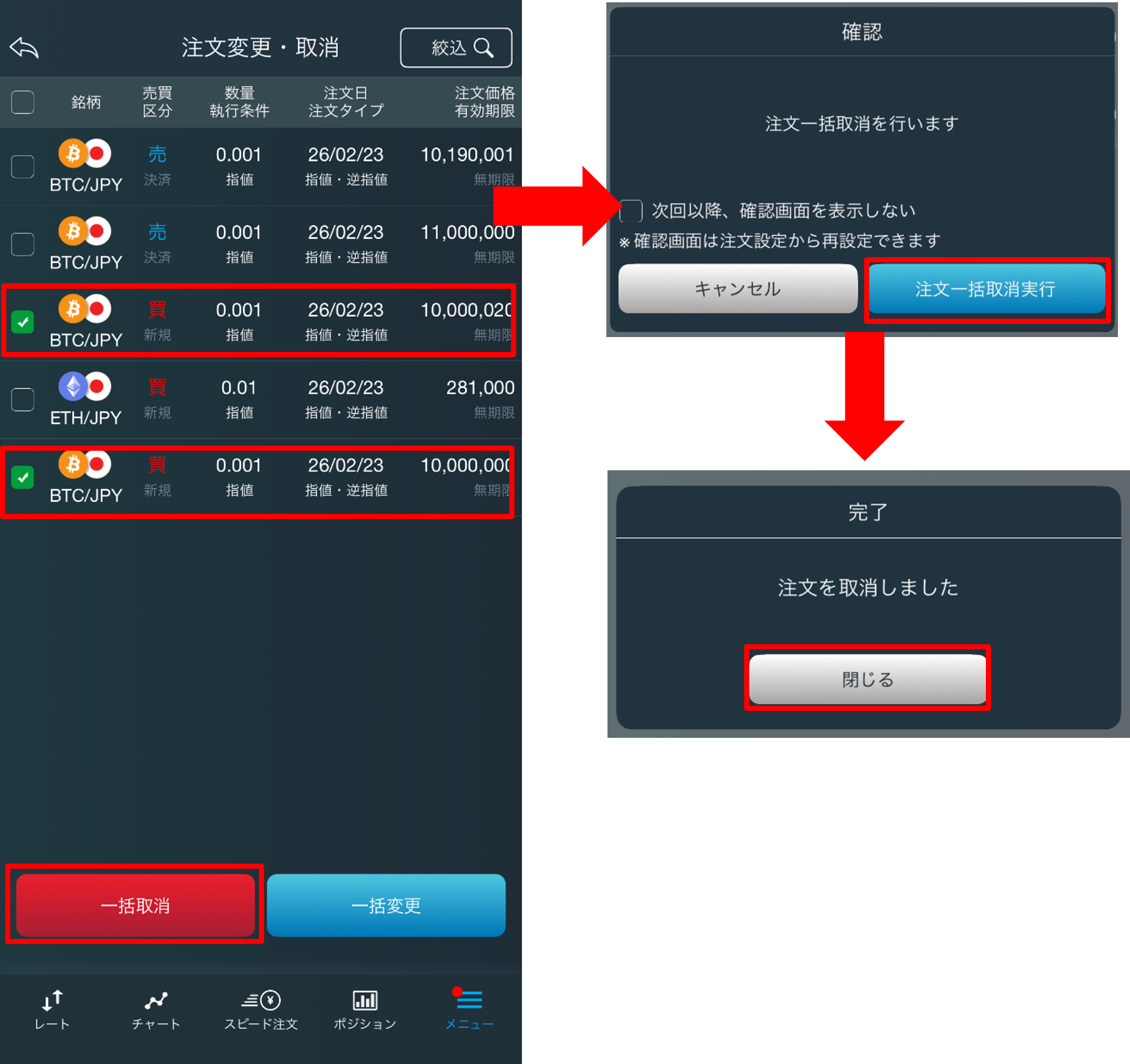 注文変更・取消画面において、複数の注文をまとめて変更・取消できる「注文一括変更」「注文一括取消」機能をご利用いただけるようになります。