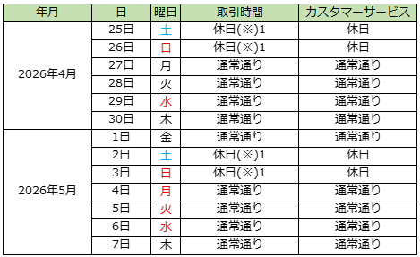 ゴールデンウィーク期間中も各サービスともに通常通りお取引いただけます。