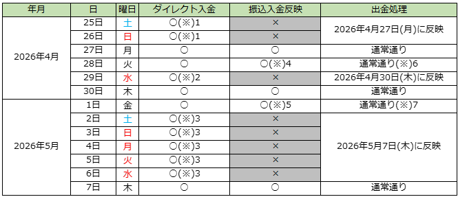 ダイレクト入金は各金融機関の休業日や当社メンテナンス時間以外でもご利用いただけますが、2026年5月1日(金)17時以降にリアルタイムで入金を反映させることができなかった場合は、通常のお振込みによる入金と同じ扱いになり、口座への資金反映は2026年5月7日(木)以降になりますのでご注意くださいますようお願い申上げます。