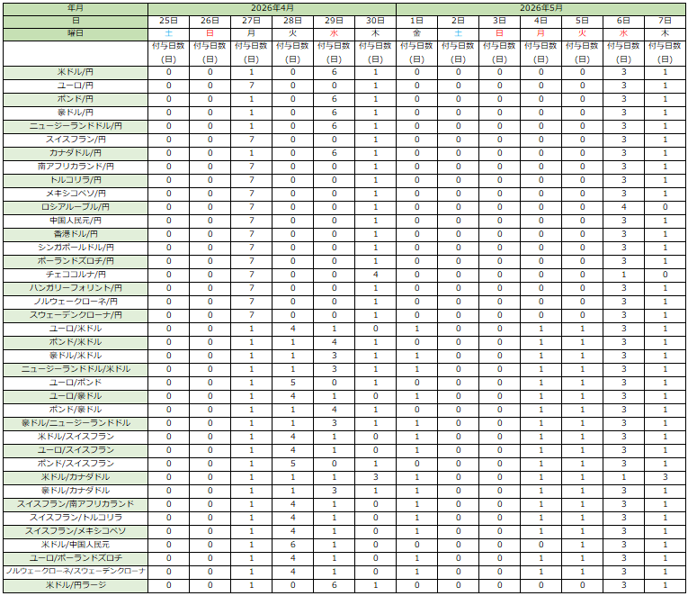 ゴールデンウィーク期間中、日本国の祝日が重なる影響から、スワップポイントの発生は変則的になりますので、ご注意くださいますようお願い申上げます。付与日数は以下の通りです。ゴールデンウィーク期間中のスワップ金額はスワップカレンダーをご確認ください。(FX口座)