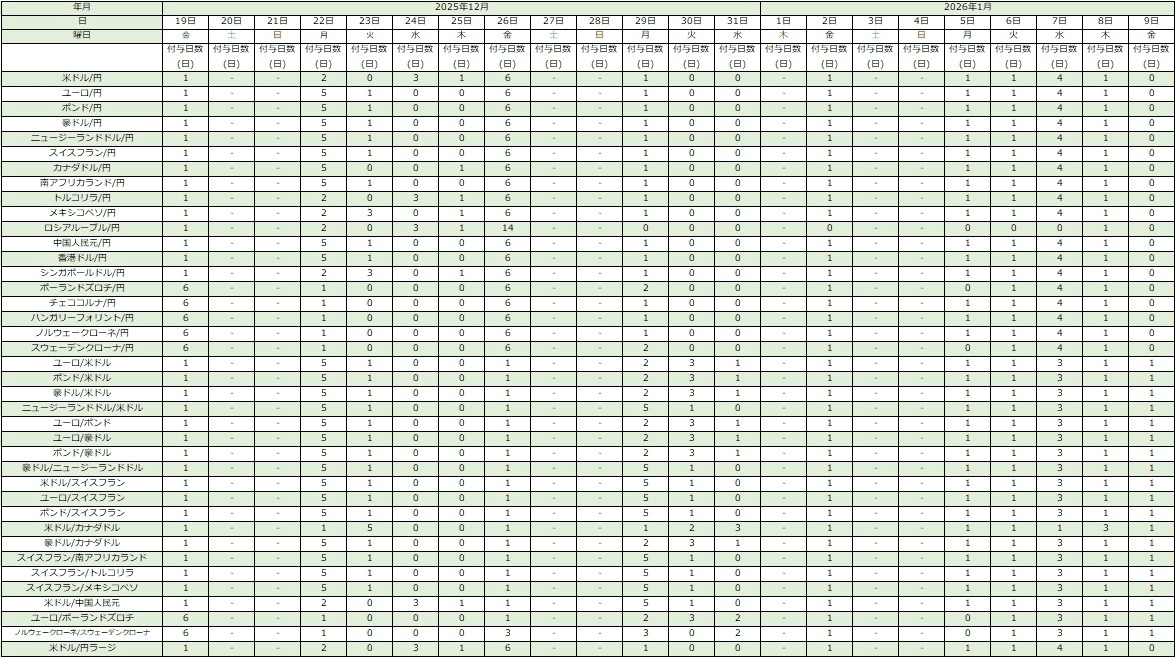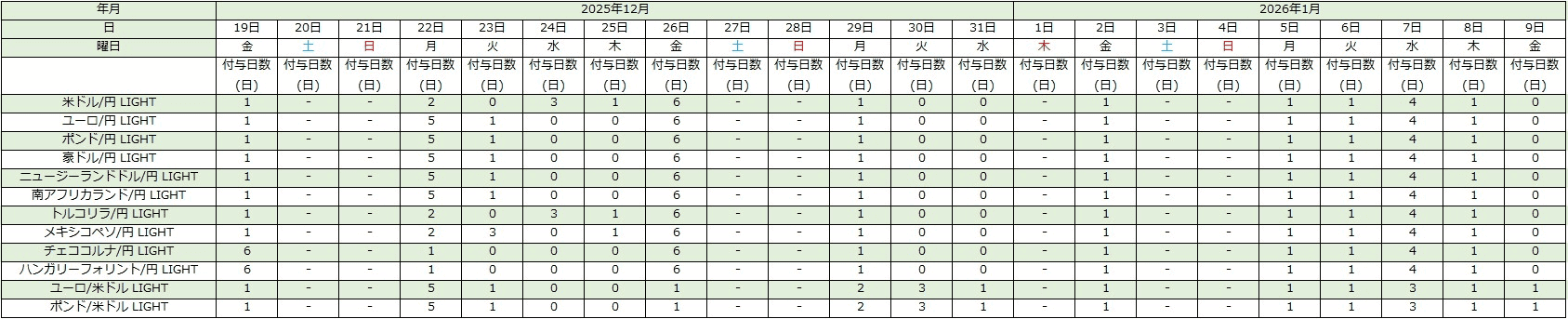 年末年始の期間は、短期金融市場の急変動により、スワップポイントの受取又は支払いの金額が変動することや、場合によっては受け払いの方向が逆転する可能性がございます。