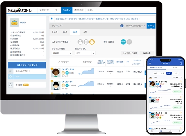 「みんなのシストレ」は初心者の方でも簡単に自動売買の設定が行えるように、SNSに似た画面で気軽に自動売買を始められるように設計された自動売買の取引ツールです。「選択型システムトレード」のため、ご自分で自動売買プログラム(「みんなのシストレ」ではこれを「ストラテジー」と呼びます)を用意したり設定したりする必要は一切ありません。「みんなのシストレ」に内蔵されている数百のストラテジーは、あらかじめバックテストで、過去の相場において勝率が高く収益をあげていることを検証したものばかりです。これらの自動売買プログラムが、「ストラテジーランキング」において、様々なカテゴリーで順位付けされているので、その中から優秀なストラテジーを選ぶだけで、24時間自動売買を開始することができます。もちろん、パソコンだけでなくスマートフォン専用アプリもありますので、いつでもどこでも自動売買が行えます。
