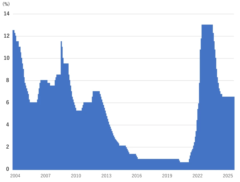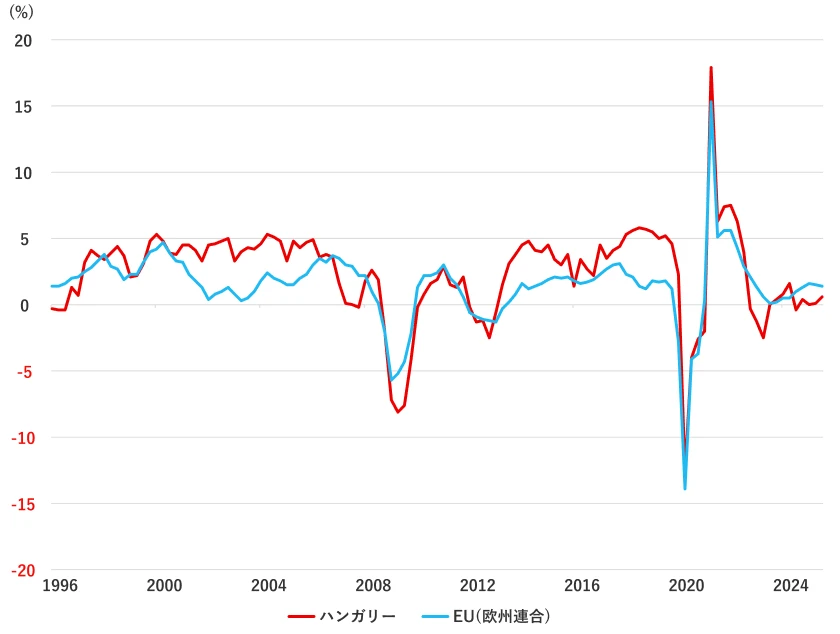 ハンガリー中央銀行(MNB)は、2023年末から正常化サイクルに転じたものの(当時政策金利13.00%)、2025年11月時点で政策金利を 6.50% に据え置いています。これは欧州連合(EU)加盟国の中で最高水準、南アフリカの7.00%と比較しても目を見張る高さです。最新の消費者物価(CPI・前年比)は4.3%(10月時点)と2023年初頭の25%超からは著しく低下したものの、MNBの目標とする3%圏を大幅に超過する状況が続いています。さらなる金融正常化・緩和に踏み切るには「持続的な物価安定」が前提とされています。他国の中央銀行と同様、経済の下押しリスクをケアしつつも、インフレ警戒で慎重に金融政策が運営されていくことでしょう。
