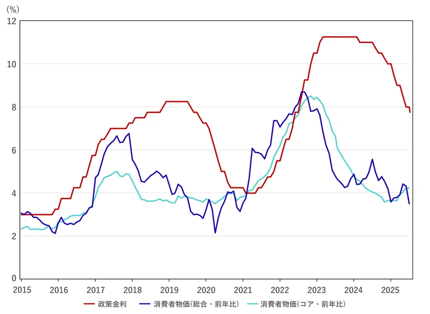 メキシコでは2022年1月、史上初の女性中央銀行総裁としてビクトリア・ロドリゲス氏が就任しました。当初は政策運営への不安視する見方もありましたが、過去の枠を大きく崩さず、インフレ鈍化に合わせて着実に利下げを進めてきました。2025年2月には政策金利を50bp引き下げ、「インフレとの戦いは新たなフェーズに入った」と発言。その後も利下げを継続し、足元の政策金利は7.75%となっています。ただしインフレの粘り強さを踏まえ、今後も「必要に応じて柔軟に対応する」との慎重なスタンスを維持しています。