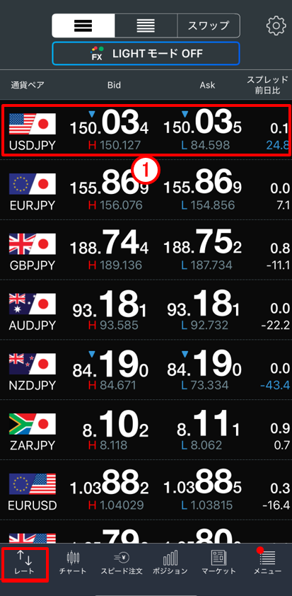 ① レート一覧画面より、 取引したい通貨ペアをタップすると、新規注文画面が表示されます。